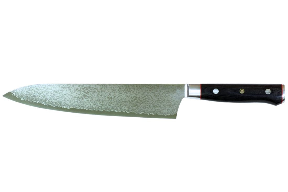 Nos couteaux de cuisine Zanmai Classic Pro sont conçus pour être performants. Son allure époustouflante et ses caractéristiques de qualité supérieure témoignent de ce que la coutellerie japonaise a de mieux à offrir. Fabriqué à Seki, au Japon, Mcusta associe la technologie moderne à l'artisanat japonais traditionnel pour produire des couteaux de qualité sur mesure finis à la main. Ce couteau mesure 38cm de long et comporte une lame damassée VG-10 avec un manche en bois de Pakka noir.