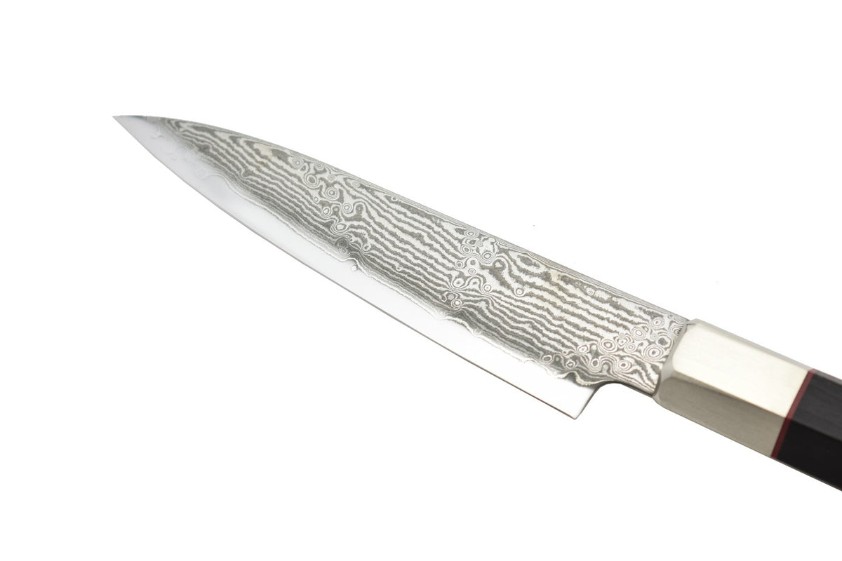 L'acier VG10 au coeur, entouré par les deux couches de damas inoxydable reste fidèle a la tradition japonaise.