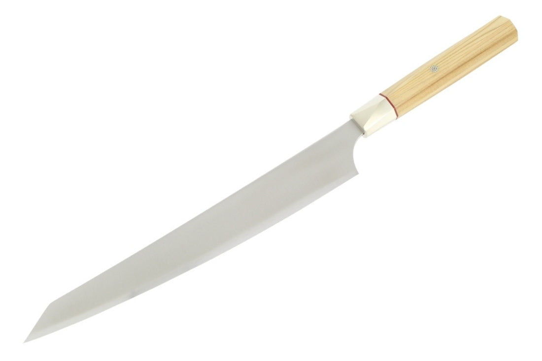 • Lame en acier Aogami Super : Lame de 24 cm (240 mm) composée d'un cœur en acier Aogami Super, entouré de couches d’acier inoxydable pour allier netteté de coupe et meilleure résistance à la corrosion.