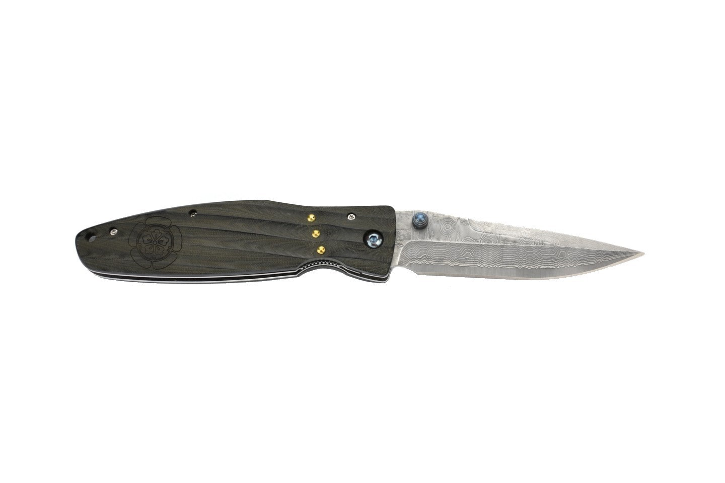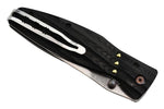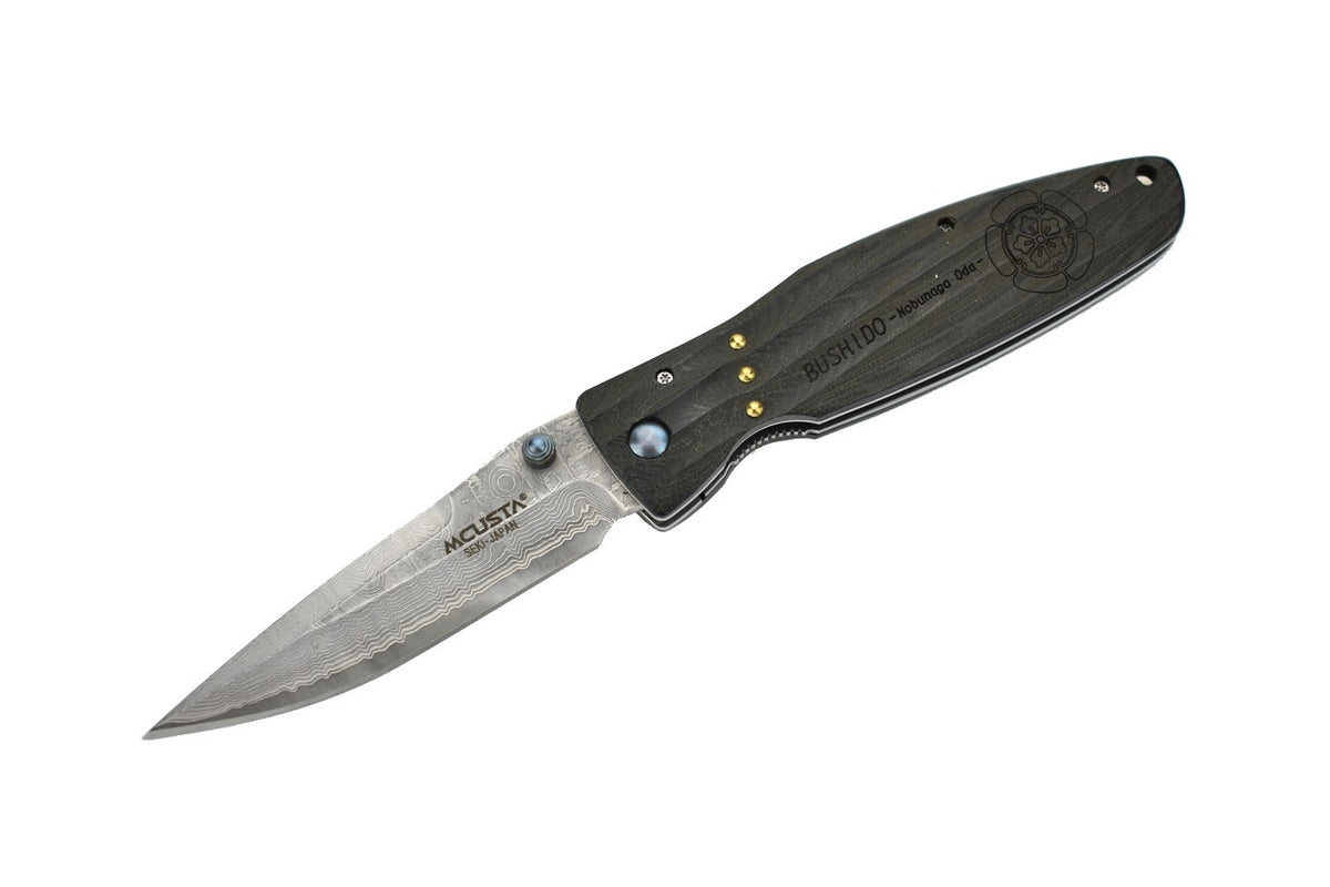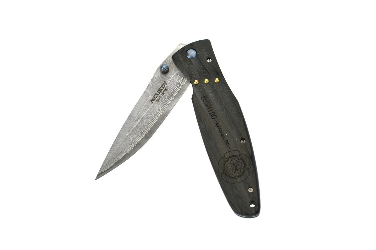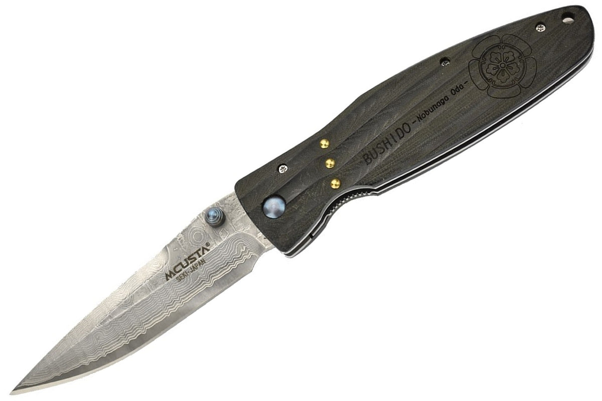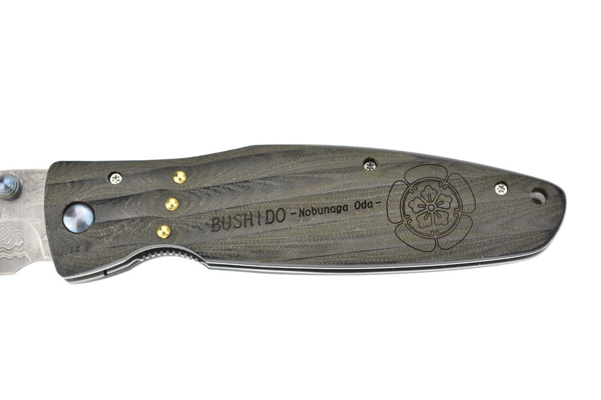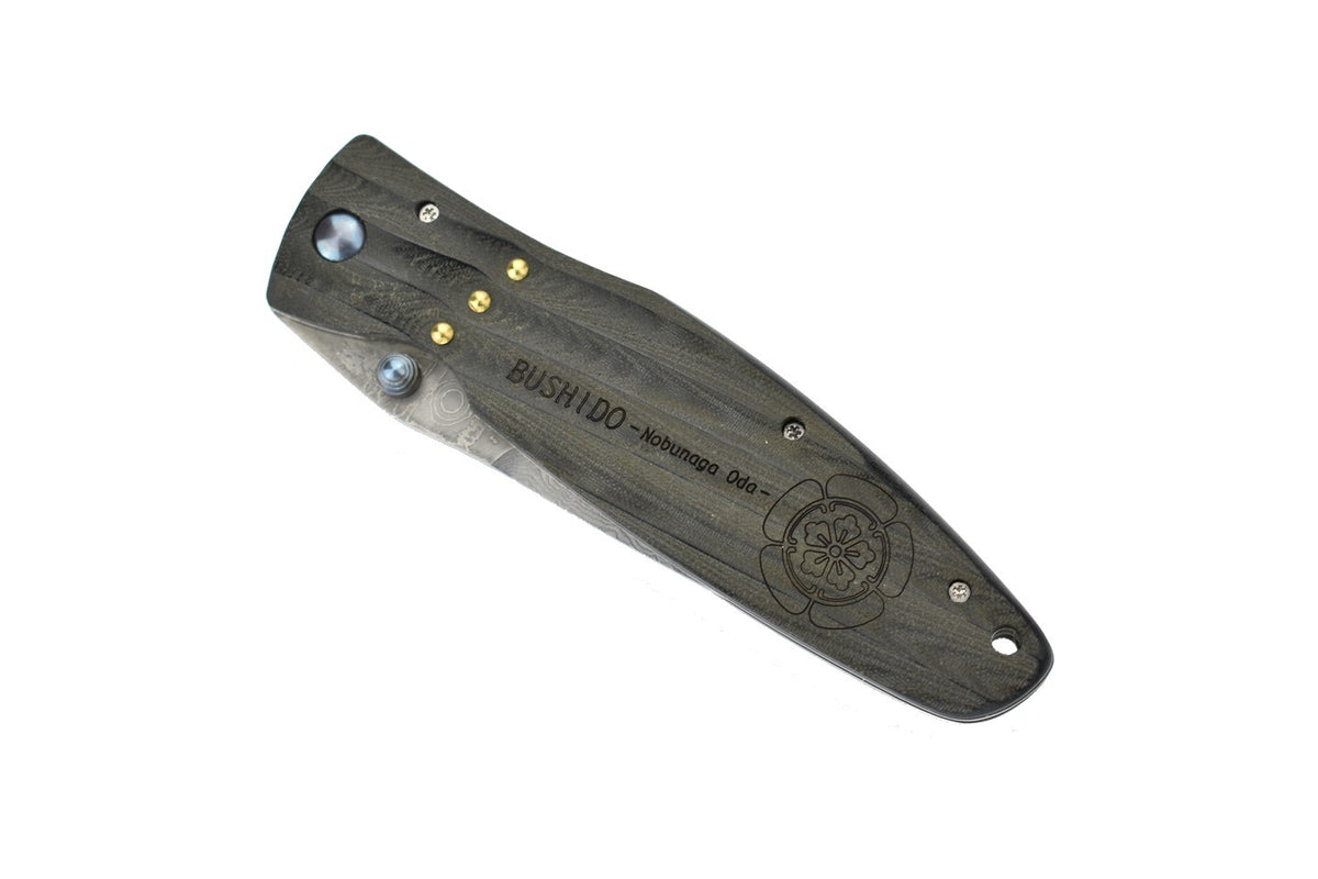 Oda Nobunaga était un daimyo très important durant la période Sengoku (16e siècle). La lame Damas a une ouverture au pouce, elle est maintenue en place par un mécanisme de verrouillage de l'intercalaire. Les vagues dans le micarta offrent une sensation exceptionnelle en main, aussi bien qu'esthétique.