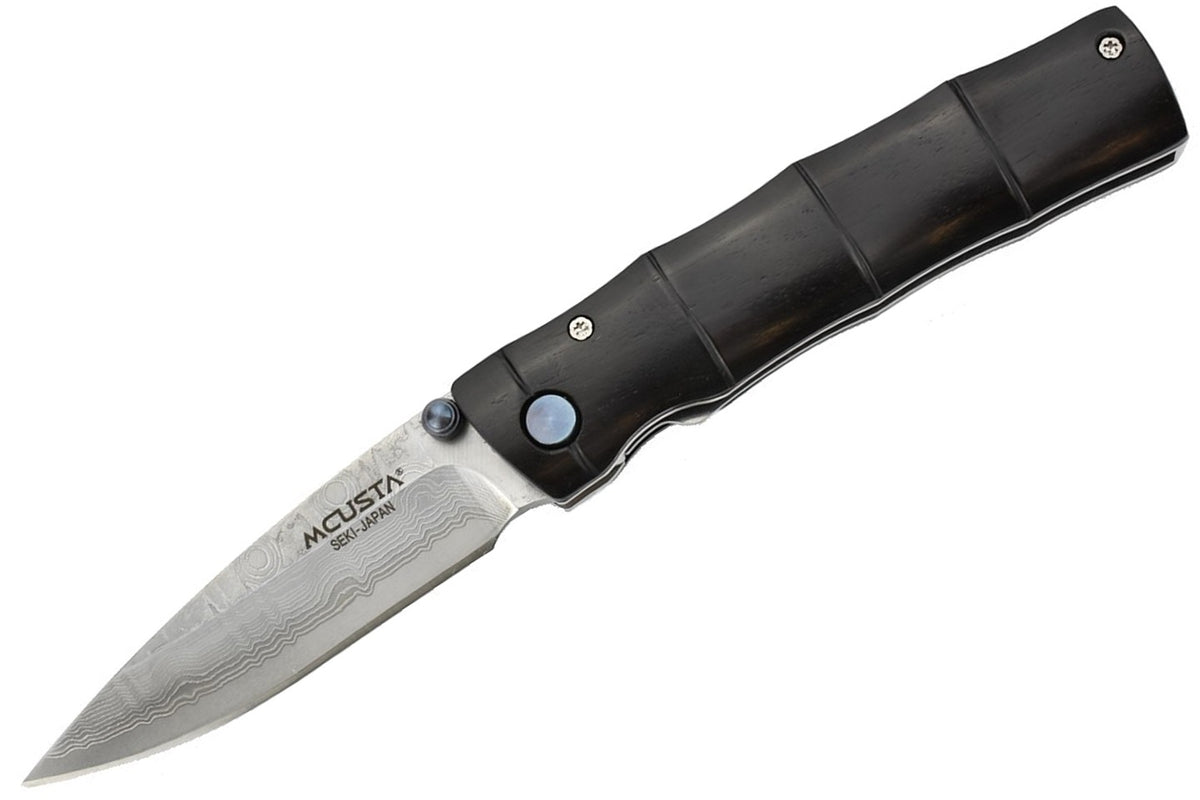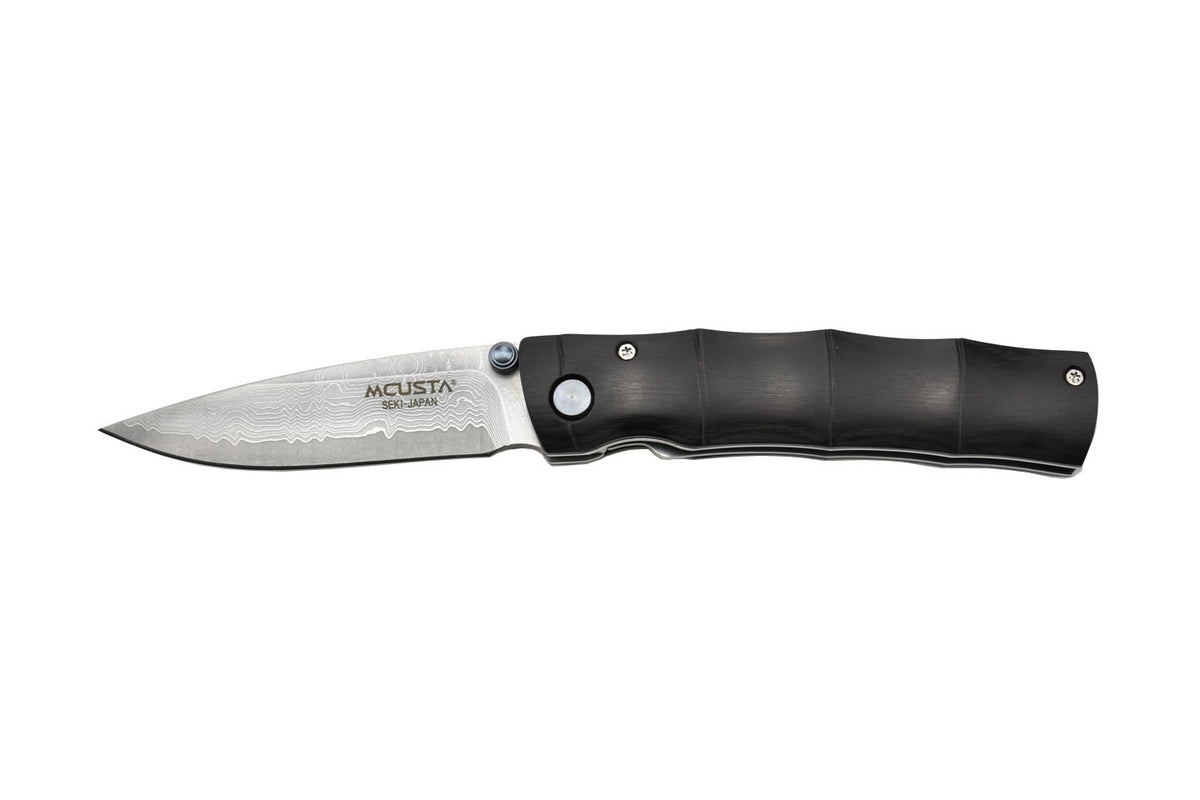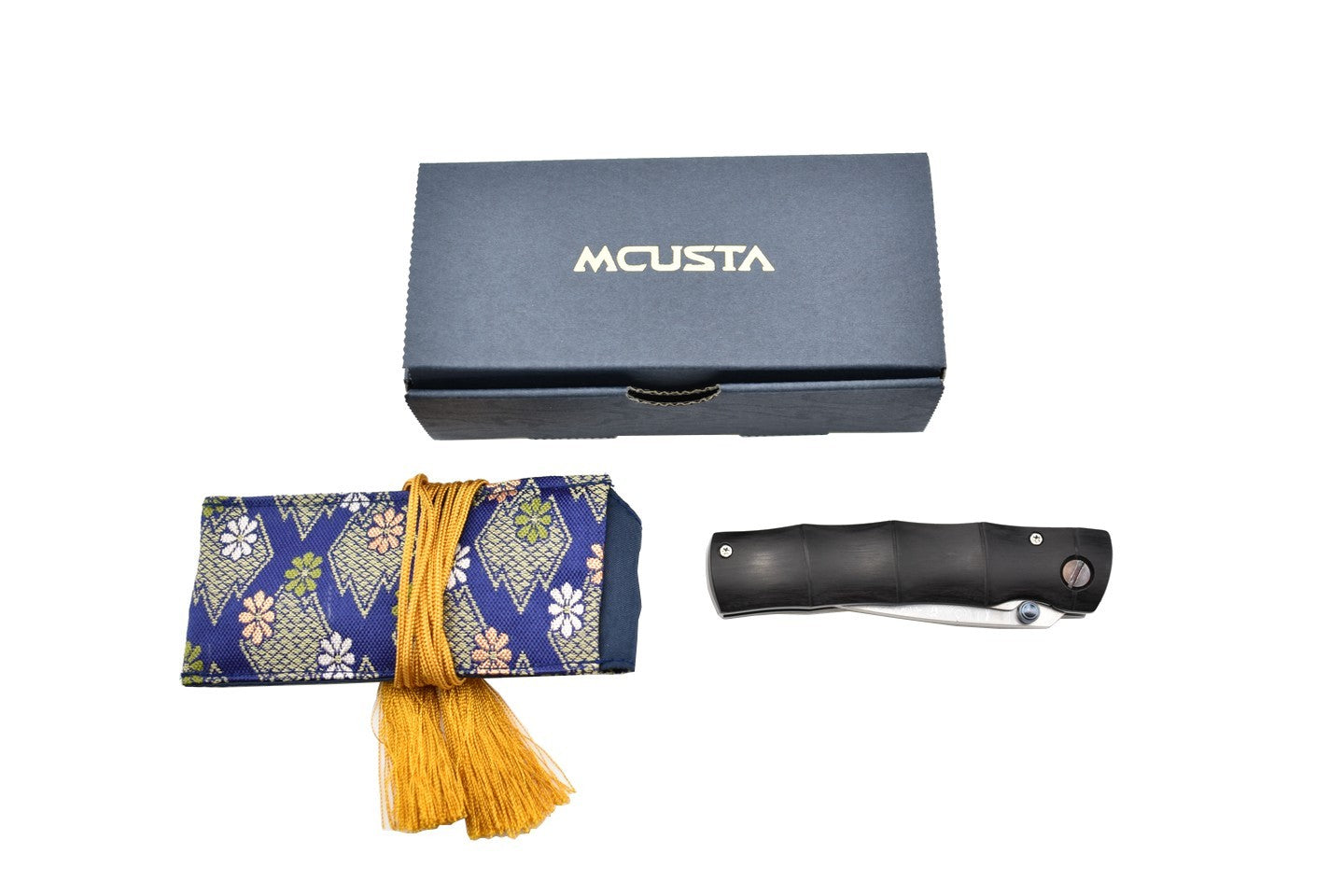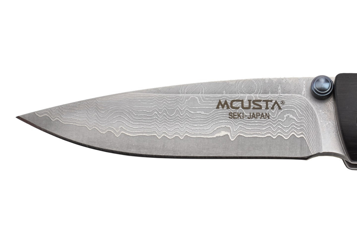 MCusta série Take avec lame damas nickel 33 couches et lame de noyau VG-10. Manche en pakkawood noir avec axe de pivot anodisé et système de rondelle en téflon pour un déploiement fluide de la lame. Thumb stud ouverture ambidextre,  intercalaires en acier inoxydable et serrure. Pochette de ceinture nishijin décorative.