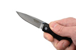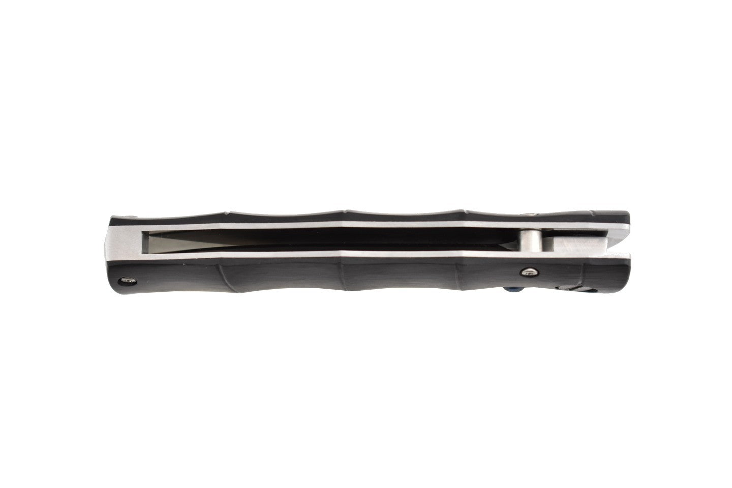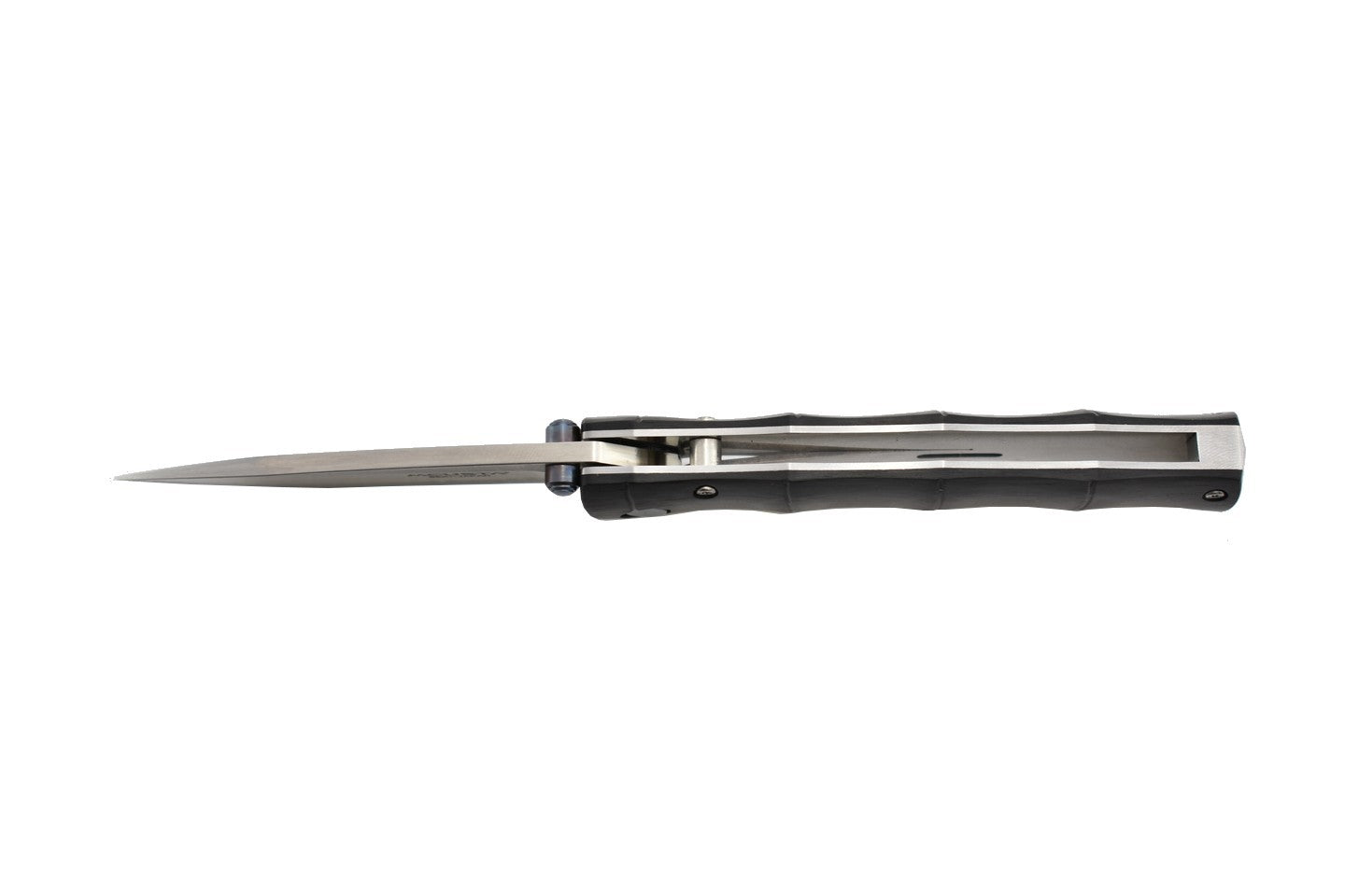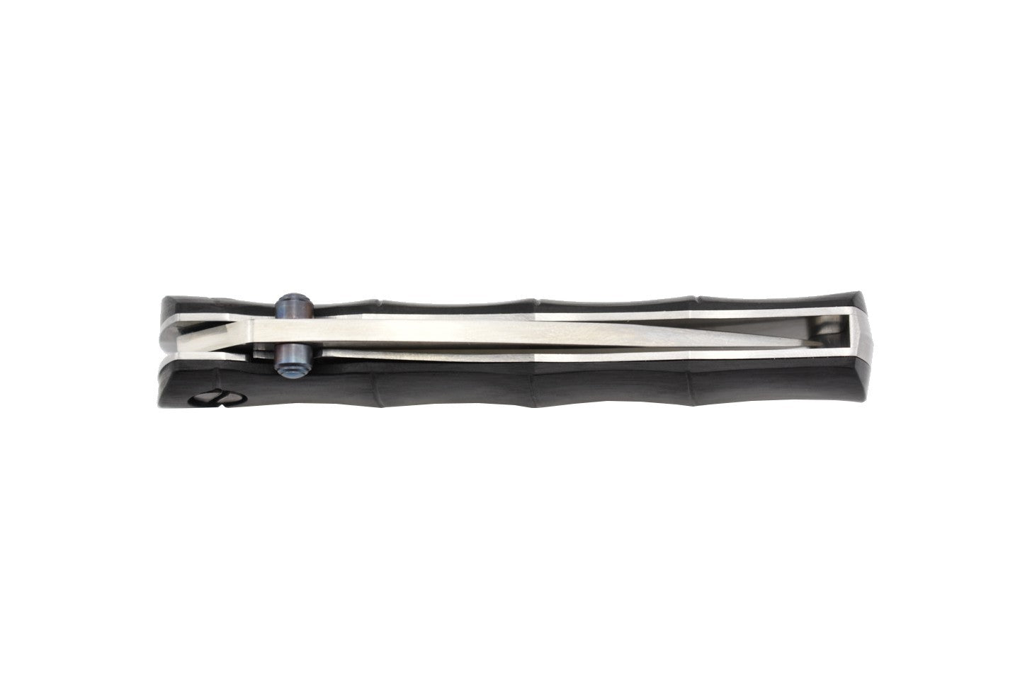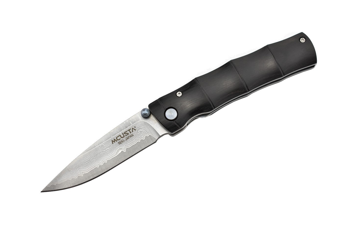 MCusta série Take avec lame damas nickel 33 couches et lame de noyau VG-10. Manche en pakkawood noir avec axe de pivot anodisé et système de rondelle en téflon pour un déploiement fluide de la lame. Thumb stud ouverture ambidextre,  intercalaires en acier inoxydable et serrure. Pochette de ceinture nishijin décorative.