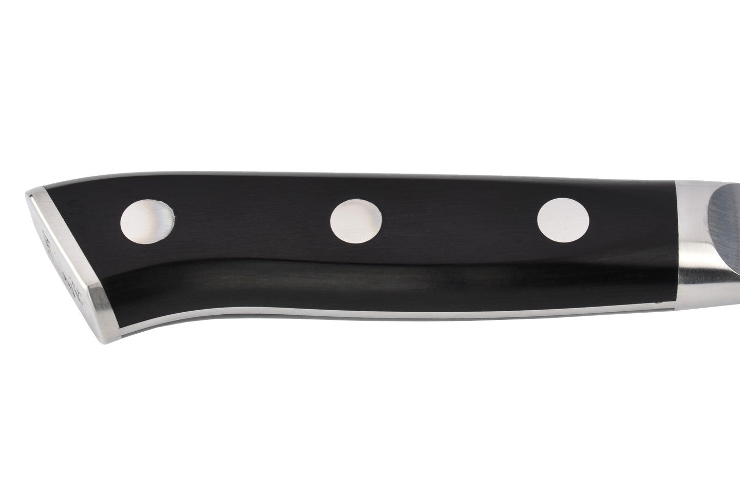 La lame en acier molybdène et vanadium 8A de ce couteau apporte une rigidité exceptionnelle pour une découpe précise. Le manche en Pakka noir et acier inoxydable offre une prise en main confortable et ergonomique.