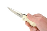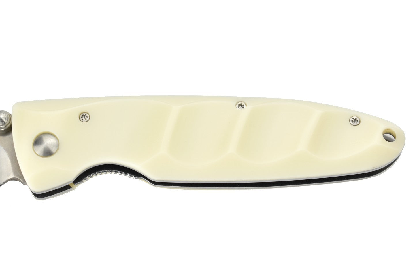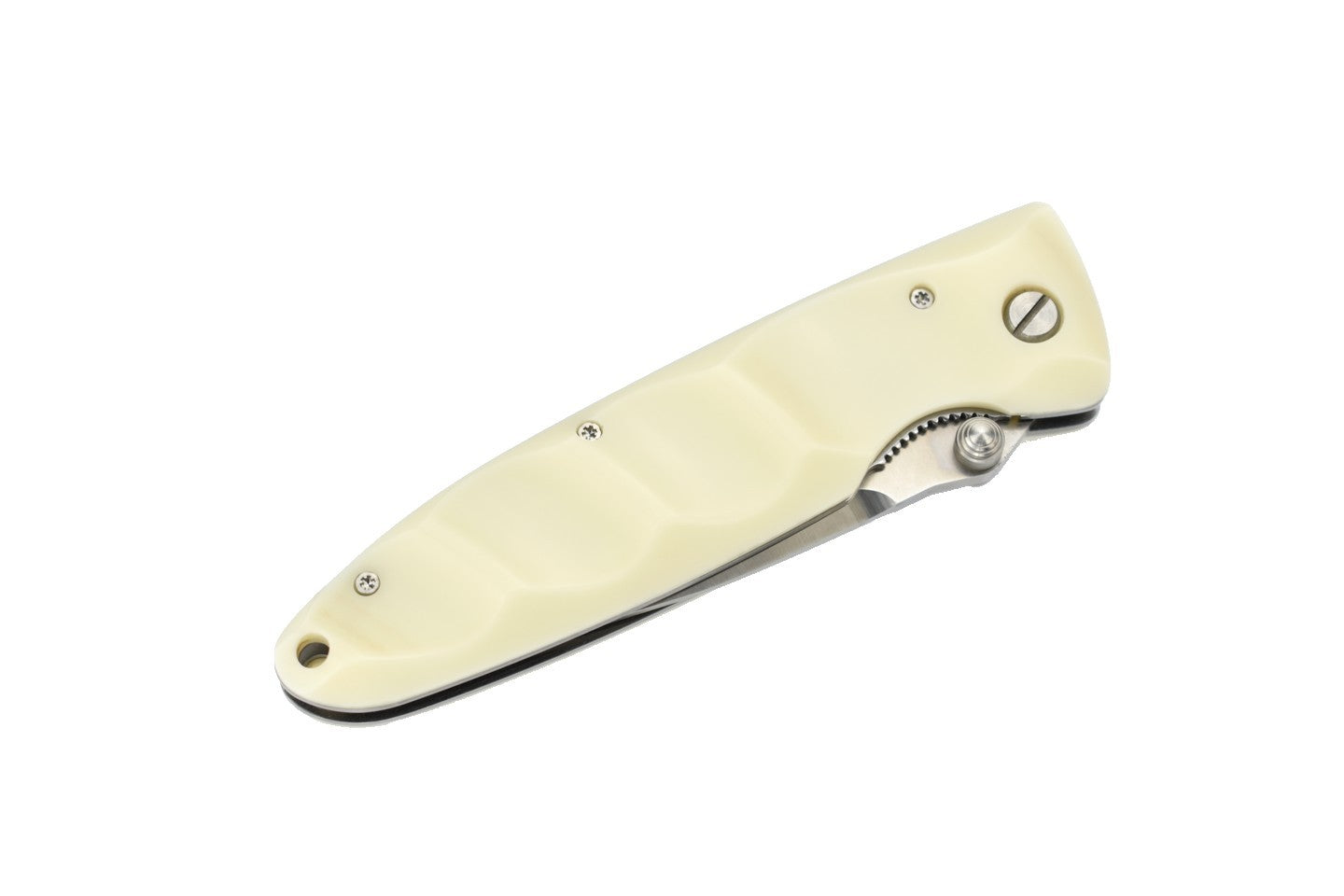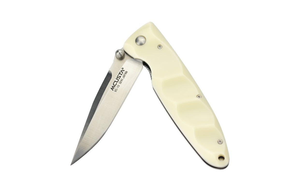 Couteau pliant japonais  MCusta MC25 série Basic avec une poignée en corian DuPont et une lame VG-10. Manche en corian DuPont avec des rainures profilées. Système de rondelle en téflon et axe de pivot anodisé pour un fonctionnement en douceur. Thumb stud ouverture ambidextre et intercalaires en acier inoxydable. Comprend une pochette de ceinture en Cordura noire.